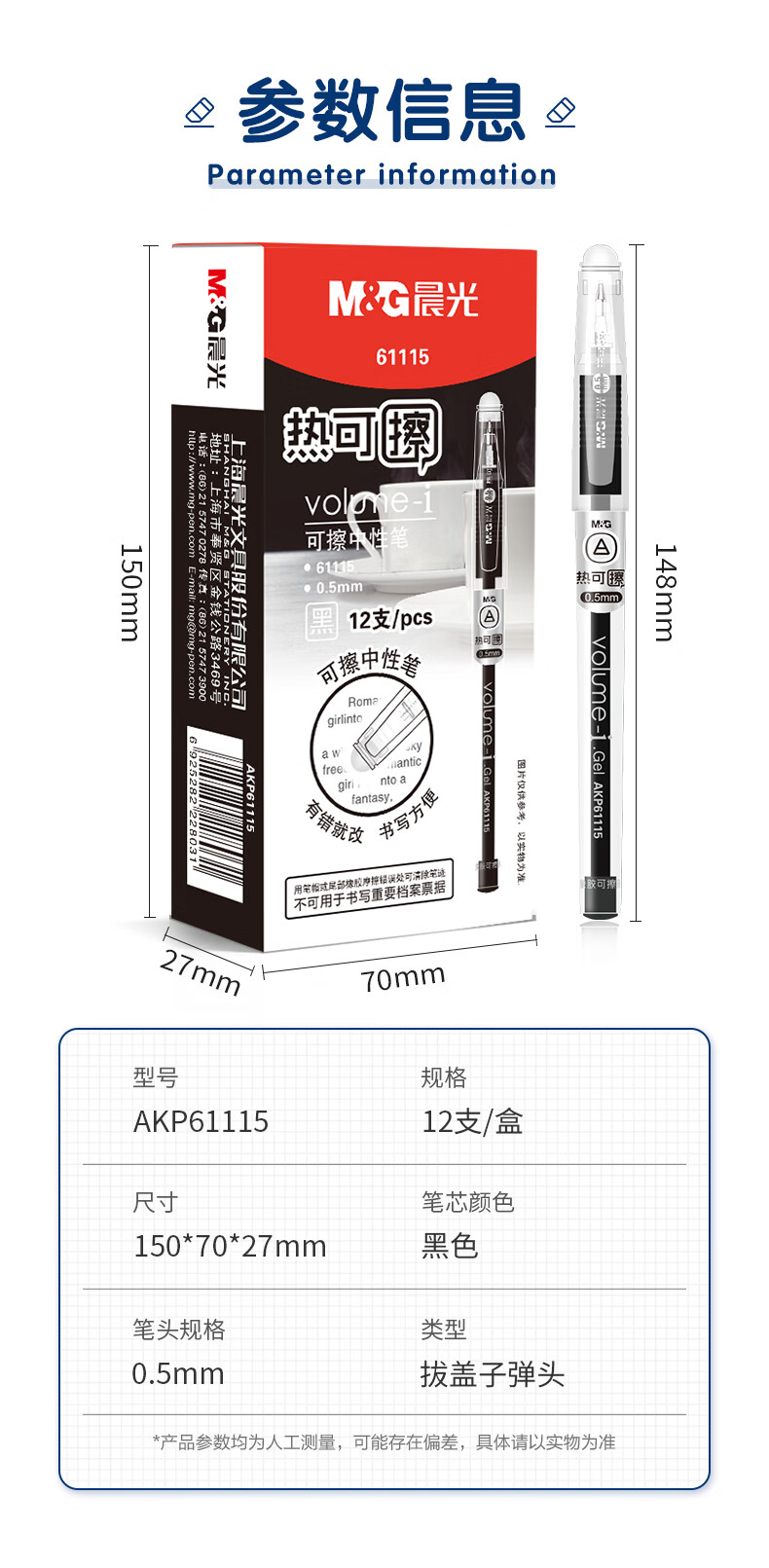 商品名稱:晨光AKP61115A 熱可擦中性筆 0.5mm簡約拔蓋子彈頭黑色水筆簽字筆 12支/盒