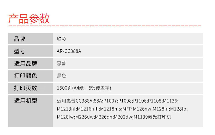 商品名稱:欣彩AR-CC388A大眾版硒鼓 適用惠普CC388A HP P1007 1008 M128fn 黑色 1500頁(計價單位:支)